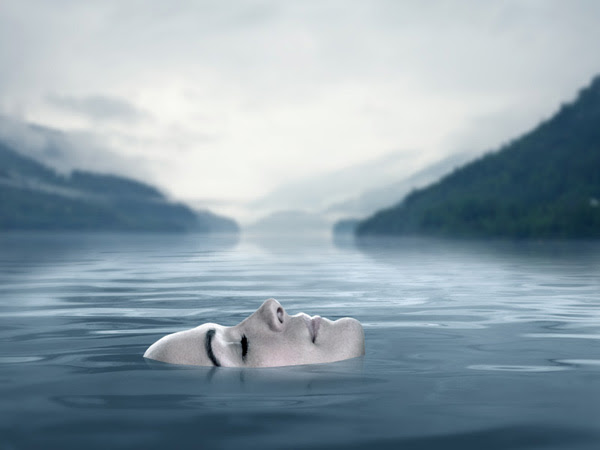 Select a soft black paintbrush (around 20% opacity) and begin brushing in underneath your face, just where the water meets the edge of the woman’s face. The idea is to give the impression of shadow building up here, cast not only by the woman’s face obscuring the main background light source, but by the presence of the woman’s form underneath the water: